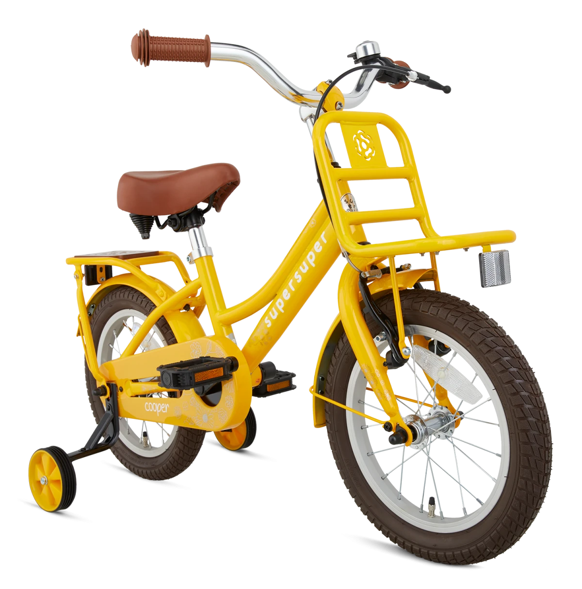Cooper Bamboo er en utrolig flot pigecykel i klassisk retro stil med trendy touch – dyb gul farve med matchende mørkebrune cykeldæk og bambus plader på både bagagebæreren og frontladet – det er en cykel man lægger mærke til! Cyklen leveres med støttehjul, som på et tidspunkt kan tages af, når barnet i klar til at cykle uden.