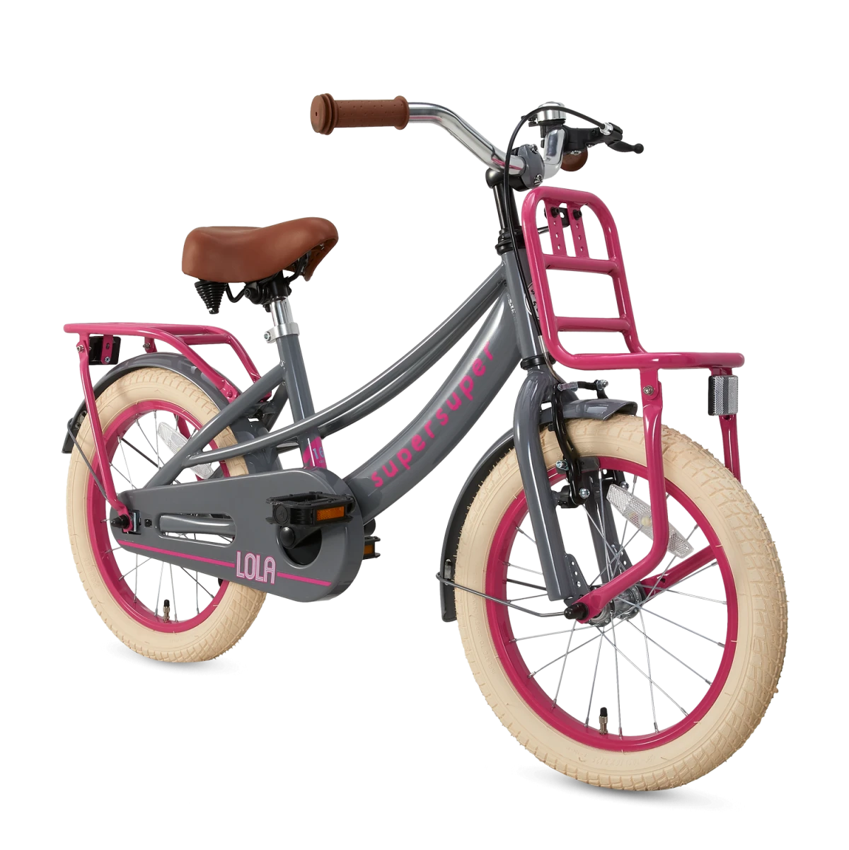 Denne flotte 16″ pigecykel Lola Super Super har et elegant design og meget spændende farvekombination: rammen i grå med detaljer i pink, der fremhæves med cyklens hvide cykeldæk, samt bred og komfortabel saddel i brun med matchende håndtag. Cyklen er udstyret med robuste frontlad og bagagebærer, hvor man kan montere en cykelkurv, hvis man ønsker det. De medfølgende støttehjul hjælper på at holde balancen og kan tages af når der ikke længere er behov for dem.