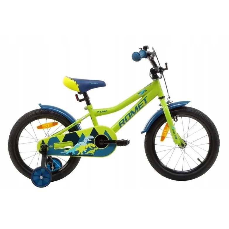 Super sej 16 tommer drengecykel fra Romet, frisk design og farver: gulgrøn stel med mørkeblå detaljer, samt dinosauer-billeder på kædeskærmen – frisk cykel til friske drenge, der ikke er bange for at tage på eventyr og undersøge verden på sin cykel. Cyklen leveres med støttehjul, støtteben, hånd- og fodbremse.