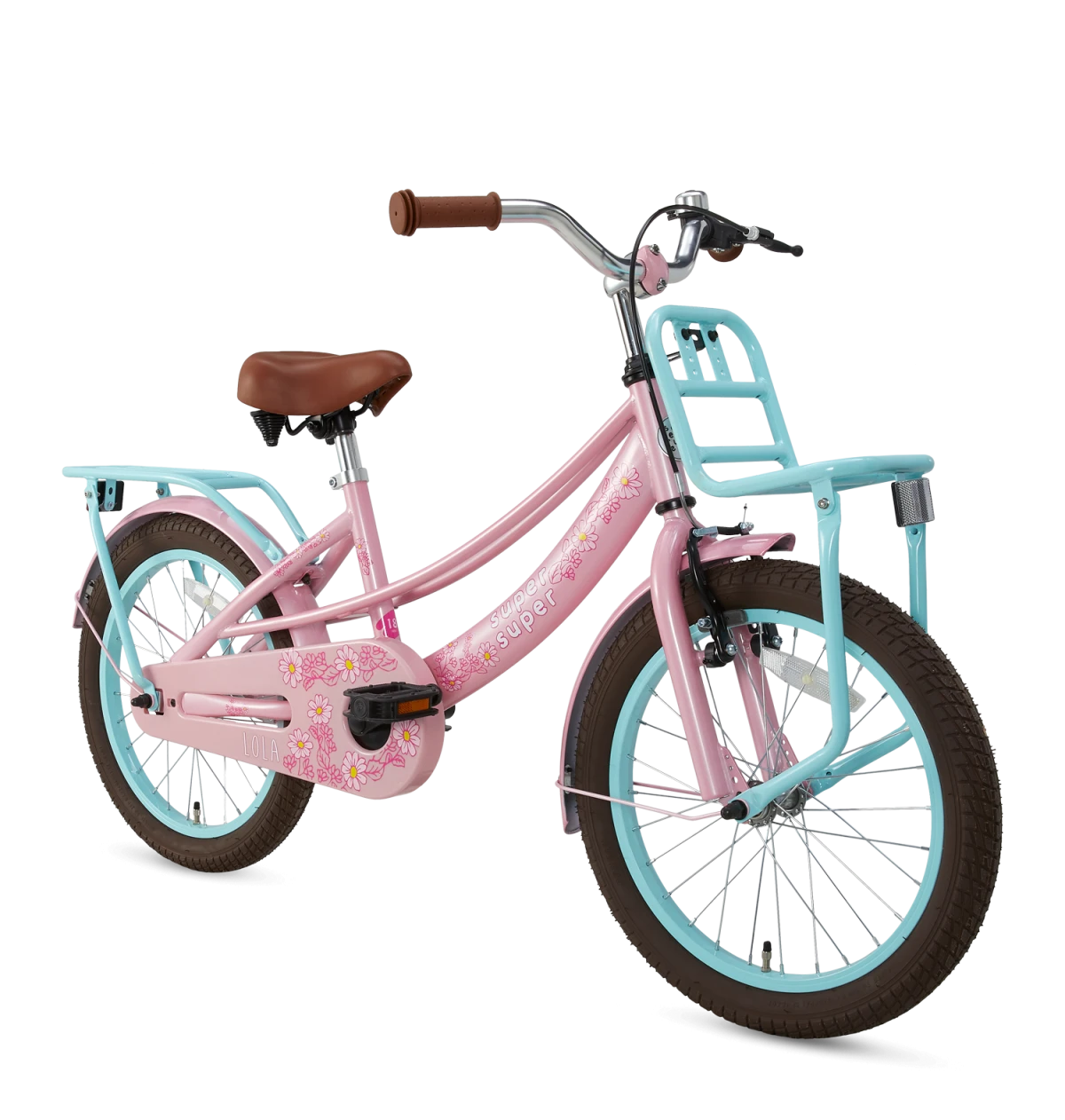 18 tommer Lola Super Super er en super fin pigecykel med flotte farver: lyserød kombineret med detaljer i sart turkis som kontrast farve. Cyklen er med robuste bagagebærer og frontlad, hvilke er ideelle når man skal cykle med sin skoletaske mm. i skole.