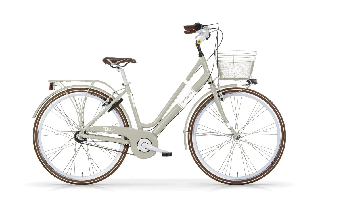 3 hastighed. Shimano Nexus FW , kassette-trapper, alu V-bremser og bremsehåndtag, justerbar stamme, brune anti-slip-pedaler, brun sadel Selle Bassano, alu dobbeltvæggede fælge, reflekterende dæk, robuste hoofing-slot, basket front.