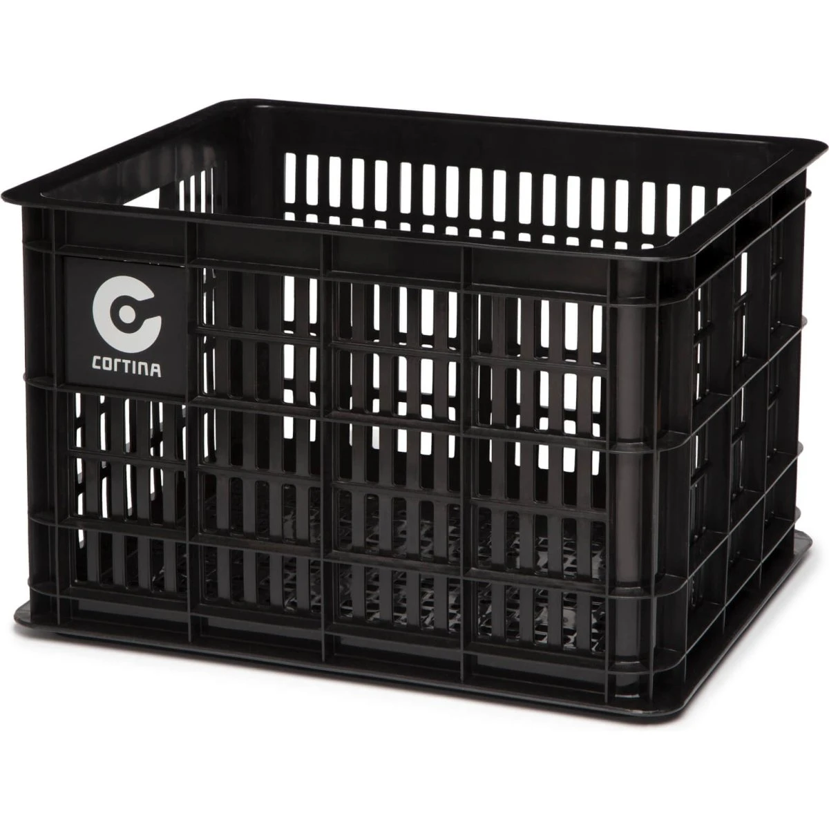 Cortina Krat Dubai sort. Lavet af plast i farven sort, udstyret med Cortina -logo. Medium størrelse, maksimal belastning afhængigt af maksimal tilladt vægt foran bærer, kapacitet 29,5 liter, 45 x 35 x 25 cm, vægt 1,03 kg.