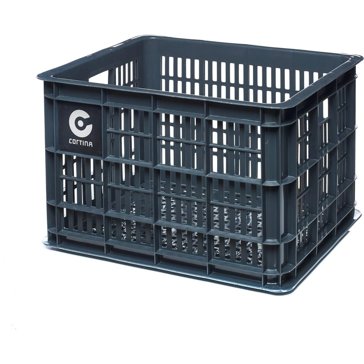 Cortina Krat Dubai blå. Lavet af plast i farven blå med Cortina -logo. Medium størrelse, maksimal belastning afhængigt af maksimal tilladt vægtforbærer, indhold 33 liter, 40 x 33 x 25 cm, vægt 0,94 kg.