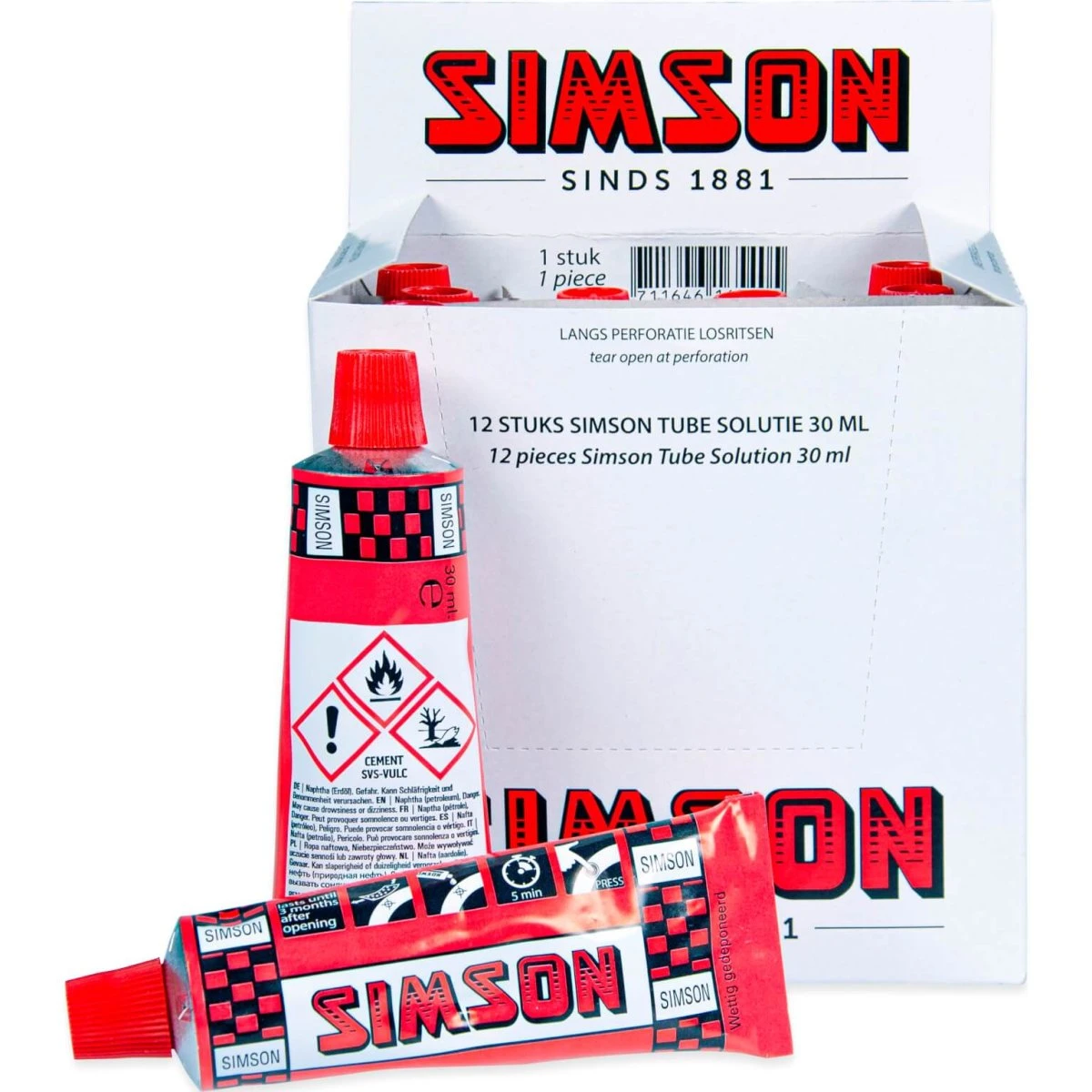 Den eneste rigtige Simson -opløsning i et klemrør på 30 ml. Uundværlig, mens du stikker et fladt cykeldæk. Løsningen er velegnet til kold vulkanisering af dækplaster. Påfør løsningen på båndet, og på grund af dets unikke hurtige formel kan dækket sidde fast efter 90 sekunder. Skal bruges i kombination med alle typer Simson Tire Plasters.