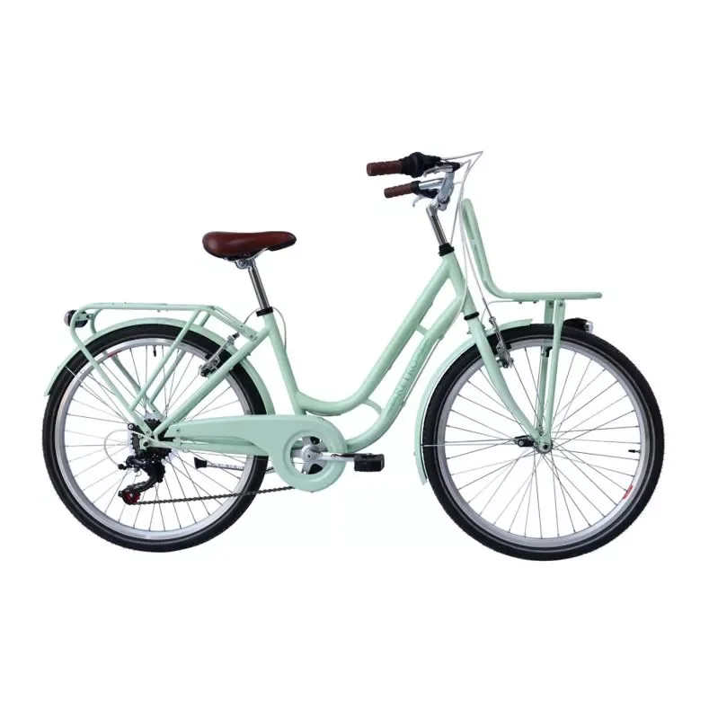 Stålmonotube, 6 gear Shimano Tourney Revoshift, Alu V-bremser og bremsestænger, robust frontbærer , alu -profilfælge , batteribelysning, reflekterende dæk, brune håndtag og brun sadel, metalfendere. – boardinghøjde: 39 cm.