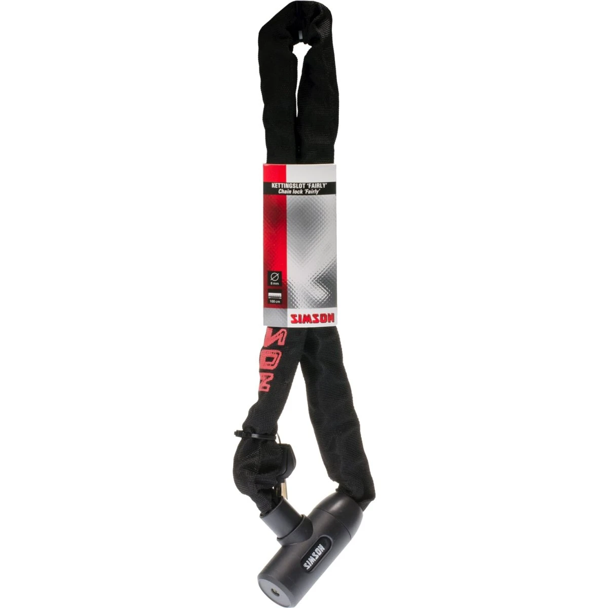 Simson Chain Lock er retfærdigt en praktisk sort kædelås med 8 mm tykke links. Tekstildækslet beskytter rammen mod skader. Kæden har en længde på 100 cm og kan let tages af kæden for at dreje sædepladsen. Den integrerede lås sikrer optimal brugervenlighed for at kunne låse cyklen sikkert. Låsen leveres med to nøgler.