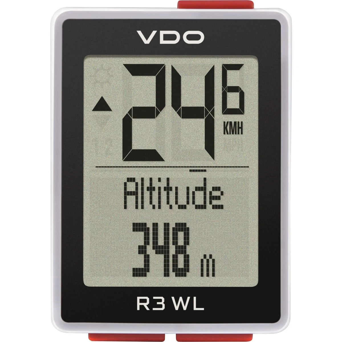 Med denne VDO R3 (digitalt kodet) trådløs cykelcomputer har du alle dine data med et blik på hånden under dine smukkeste ruter i bjergene eller bakkerne i South Limburg eller Ardennes. Uanset om det er på racercyklen, gruscykel eller mountainbike, tælles hver mere højde! Den vandtætte cykelcomputer viser hastighed, afstand, total afstand, køretid, ur, gennemsnitlig og maksimal hastighed, total køretid, gennemsnitlig og aktuel hastighedssammenligning og temperaturen. Det oplyste display er let at læse selv i mørke. Takket være den integrerede barometriske højde måling er Hiigte pålidelig. Du kan også indstille 2 hjulstørrelser og derfor let skifte mellem racercyklen og mountainbike. Desuden kan du følge dine totaler på de sidste 12 måneder. Det er meget let at indstille hjulomkretsen på grund af de forprogrammerede hjulstørrelser. Med de medfølgende kabelbånd kan den vandtætte cykelcomputer hurtigt monteres på styret og let indløses og opbevares til beskyttelse mod tyveri. Den integrerede knapcelle (CR2450) er tilstrækkelig til at levere computeren i mere end to år. Ved at forbinde R3 WL med en valgfrit tilgængelig pedalfrekvenskanal (art. Nr. 64942), kan du også måle pedalfrekvensen.